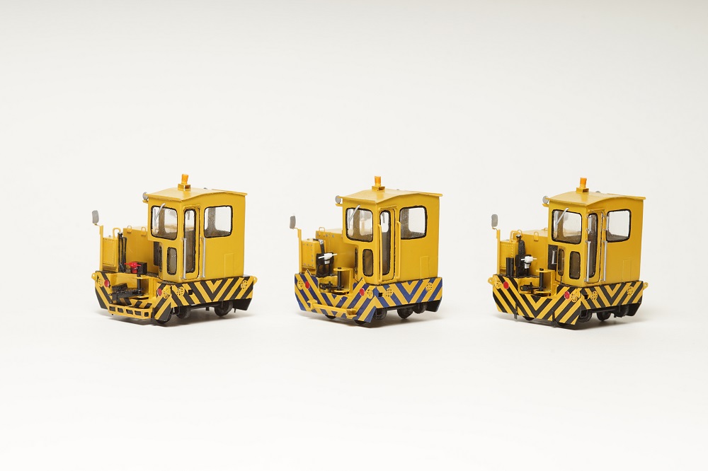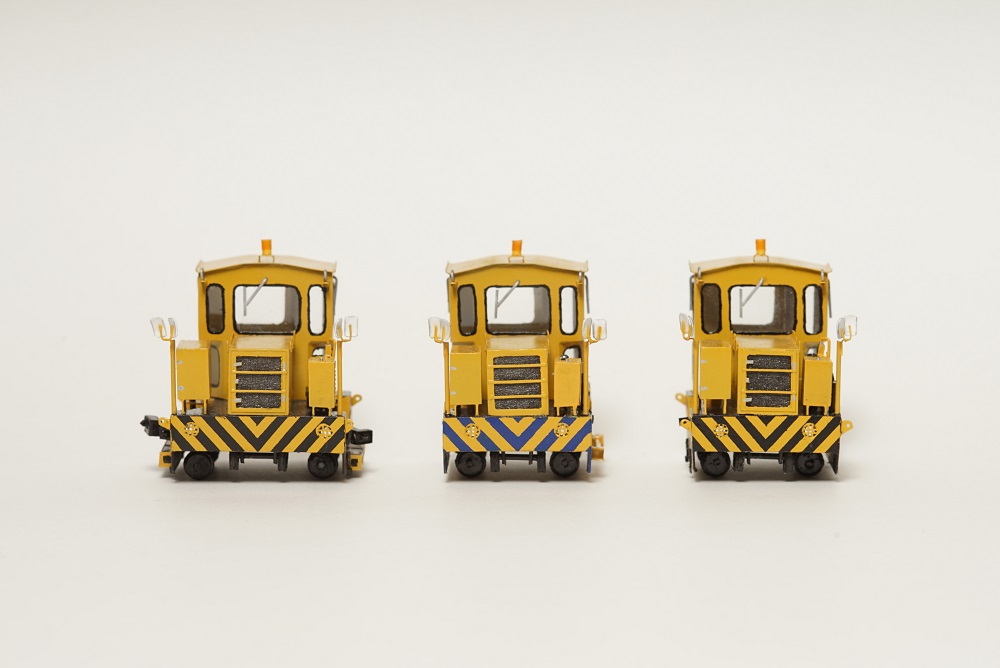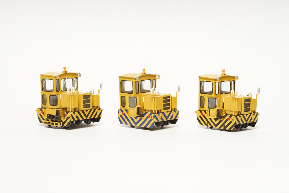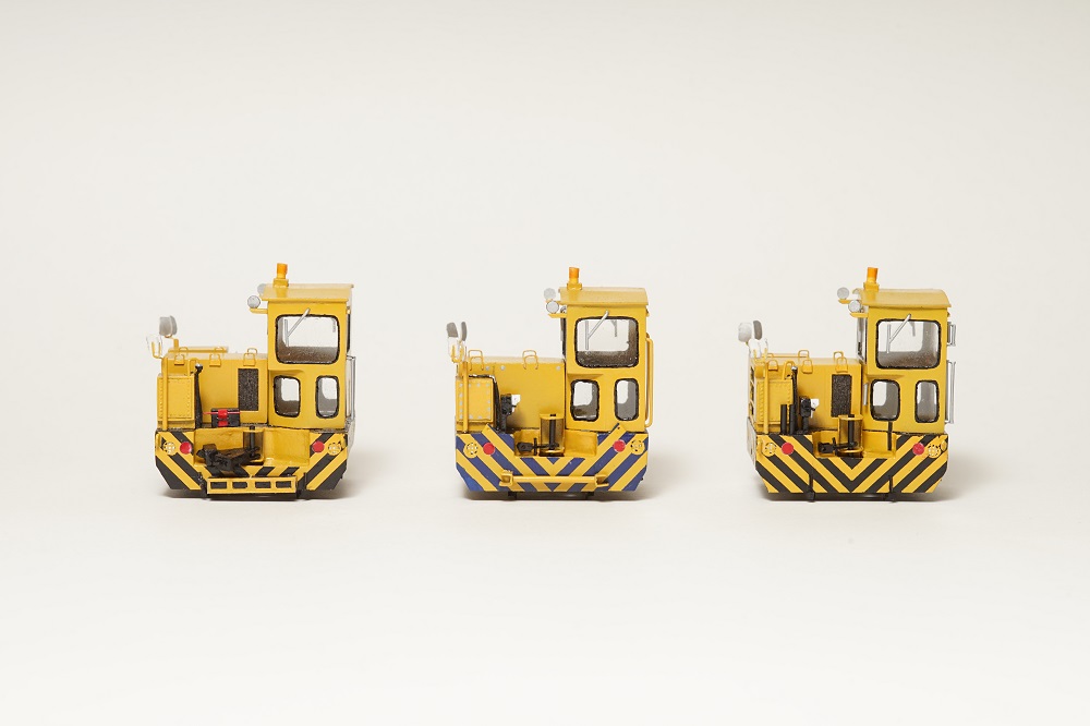 コンパクトな軌陸型アントANT35D‐R。少ないスペースにぎっしりと機器が詰め込まれているのが特徴。 キャビンの窓が一部斜めになっている点もアントの中では珍しい。 同じキャビンを持つ同形状のアントを3台同時に制作しました。左からANT30DB‐R、ANT30D‐R、ANT35D‐R それぞれのアントに共通点や相違点があるので、間違い探しが楽しめる!? 左の1台のみ標準軌仕様で全長が少し長くなっています。