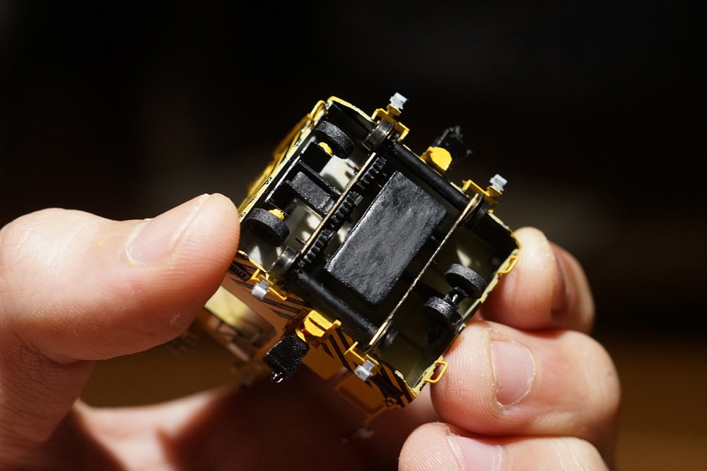 車体がとても小さいため完成時の総重量は25g。中央に見えている長方形のパーツが重りなのですが、これのおかげで低速でも走ることが可能。